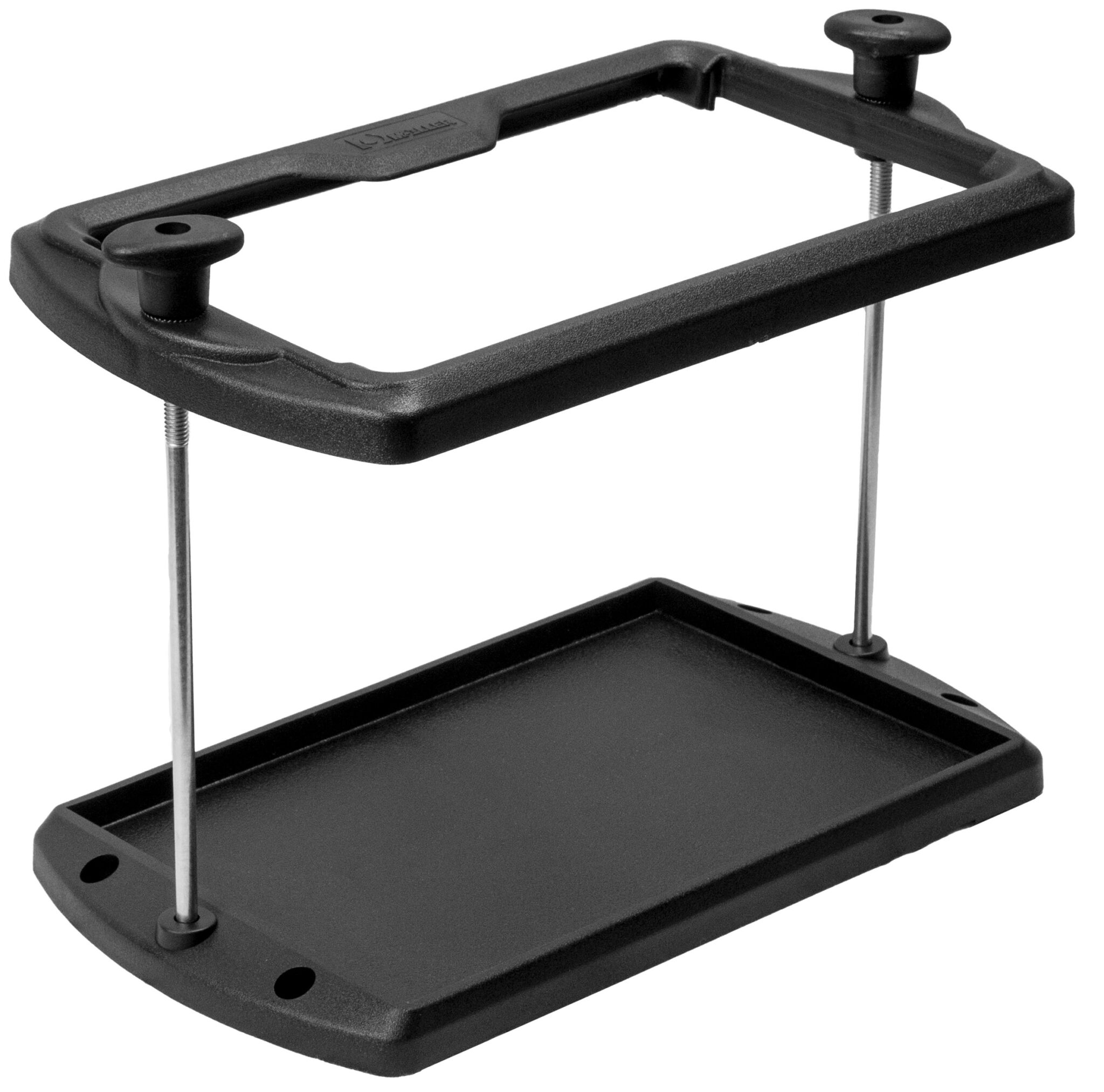 The Moeller black plastic battery tray is supplied with the hold-down bracket. There are no metal parts to corrode. Fits in confined spaces too small for a battery box.