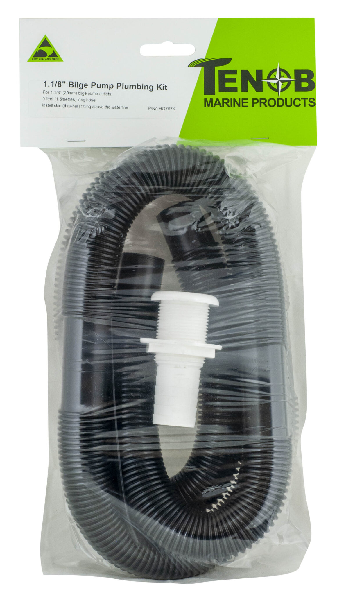These kits are supplied with 1.5m of corrugated bilge hose, a matching skin fitting, plus two nylon hose clamps.