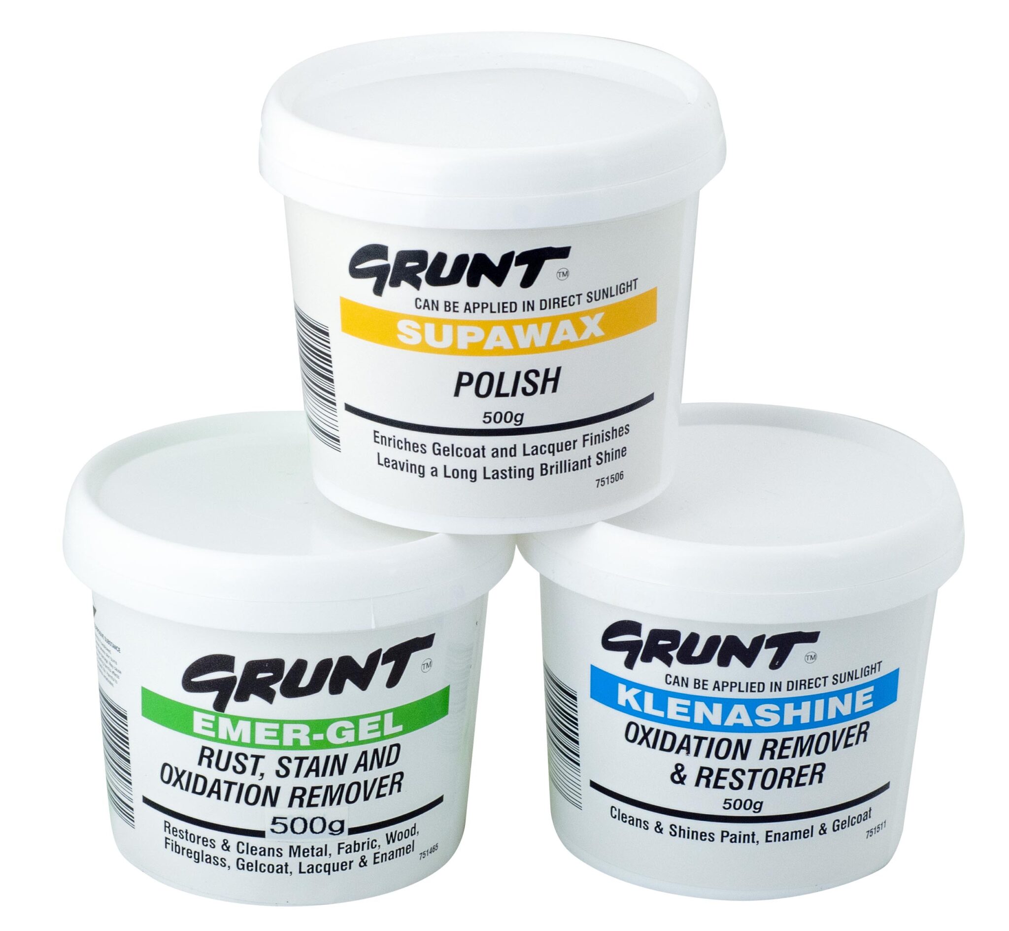 The GRUNT range of multi-application cleaning and polishing products includes the EMER-GEL rust, stain and stainless steel oxidation remover, KLENASHINE oxidation remover and restorer and the SUPAWAX gelcoat and lacquer finishes polish.